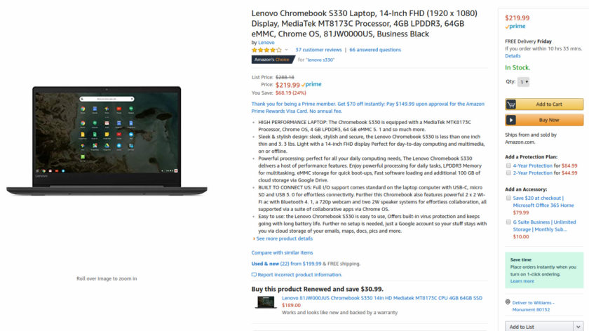 If you need a laptop that just gets the basics done, the Lenovo Chromebook S330 might be the one for you. Right now, you can pick it up for $159 for the 720p version and $219.99 for the 1080p version. Keep in mind that the 1080p version has double the eMMC storage (64GB) of the 720p version (32GB).