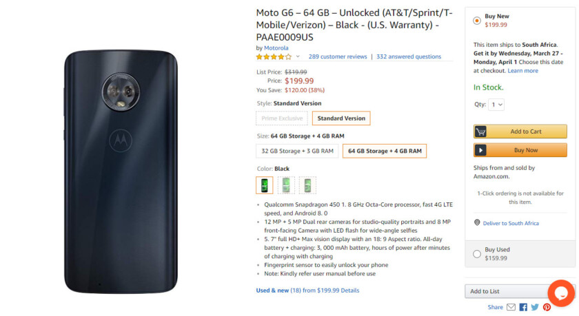 The online retailer has slashed $120 off the 64GB Moto G6, bringing its price down to $199 (from $320). This particular model is the standard, unlocked variant in black, and packs a U.S. warranty for some peace of mind.