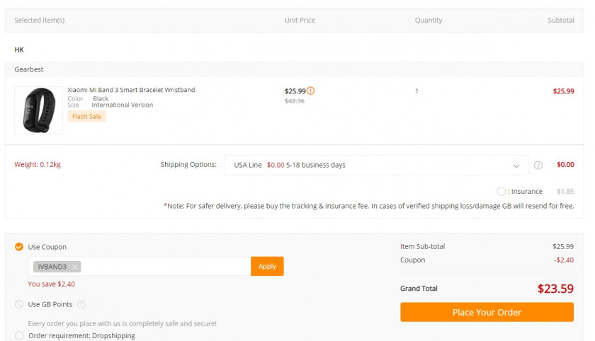 To get the $24 price for this Xiaomi Mi Band 3 deal, you have to use the code IVBAND3 at checkout. Unfortunately, GearBest makes you run through almost the entire checkout process before you can enter the code and see your final total, which means setting up an account, filling out your shipping details, etc.