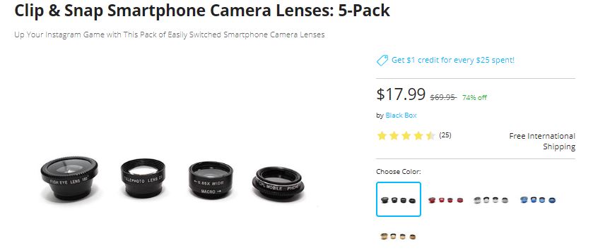 The smartphone camera lenses pack comes in five colors to match your phone. You can’t put a price on great photos, but this is a pretty good try.